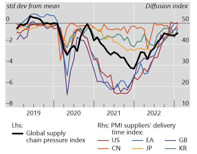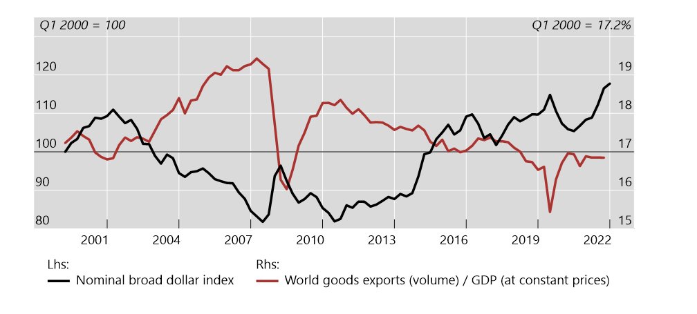 The broad dollar index turns out to be a good barometer of financial conditions for the fluctuations GVC activity; a strong dollar goes hand-in-hand with tighter financial conditions that dampens supply chain activity