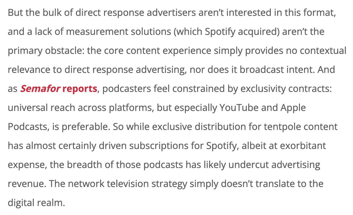 6/ The problem with the strategy is that podcast advertising is inherently difficult to measure, and the broadly-appealing podcast content Spotify acquired has no contextual relevance for advertisers. It's not appealing to direct response advertisers that want to drive outcomes.